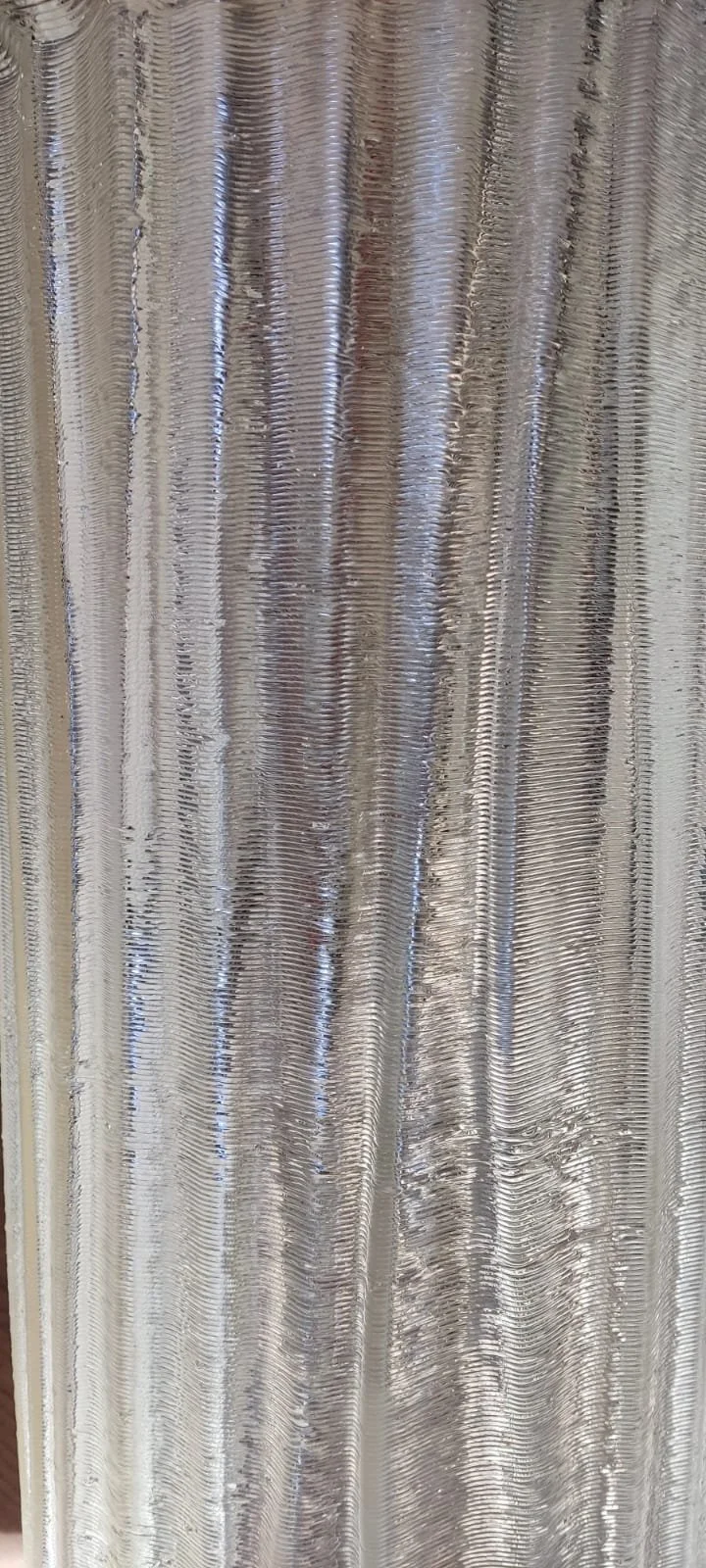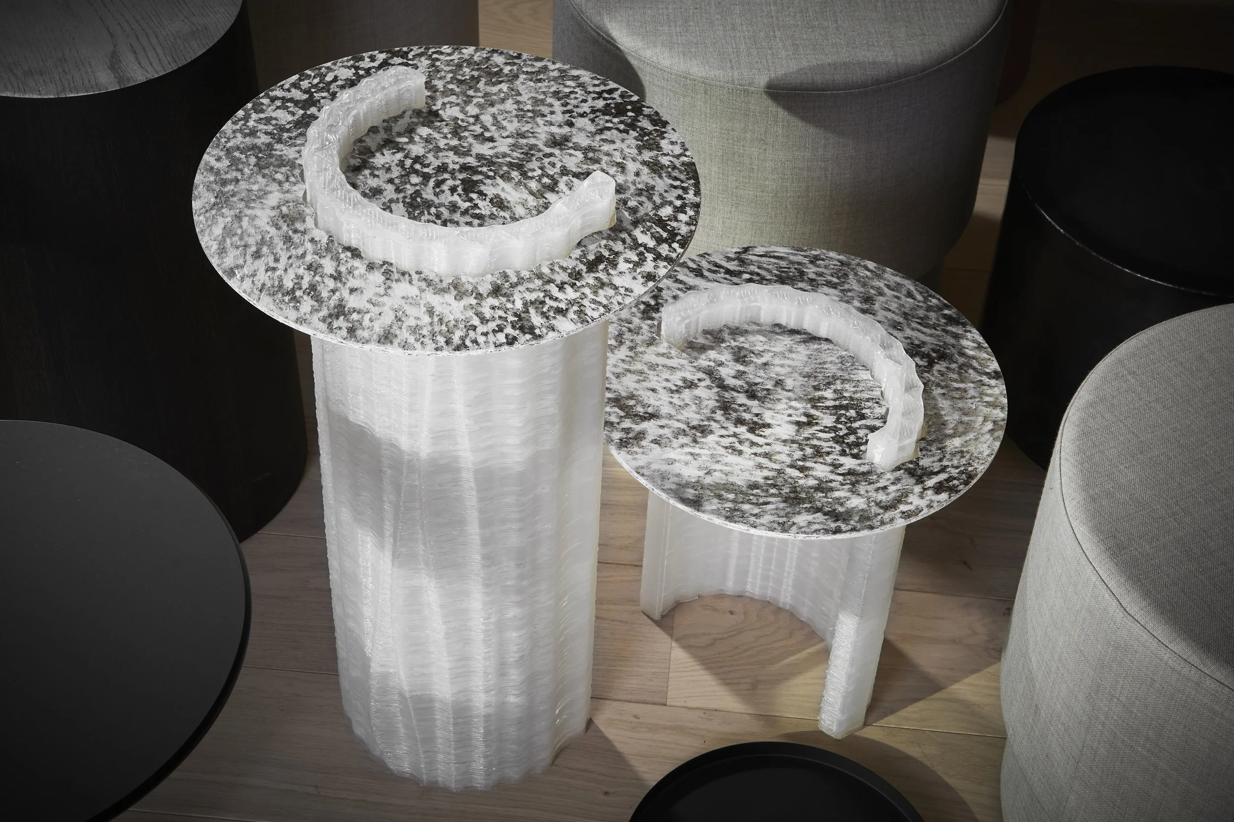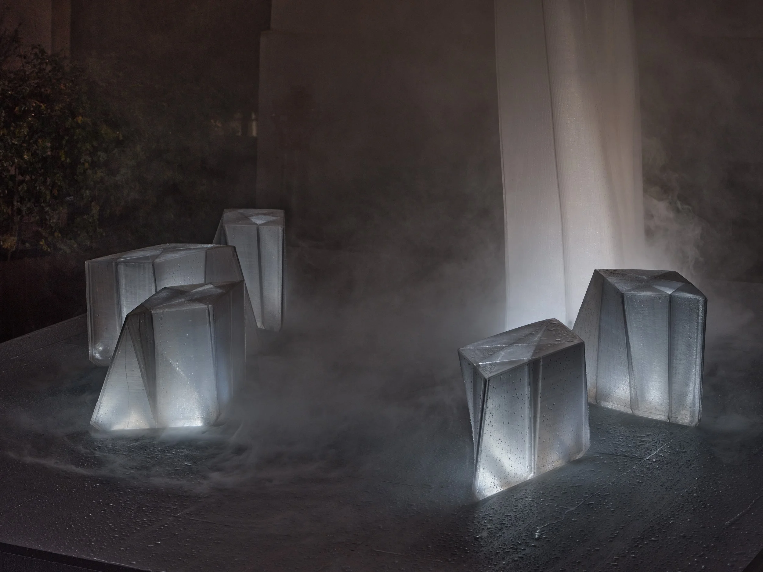 Sofia: I embrace digital craftsmanship. My sugar‑based stools use pigments that mix unpredictably in the extrusion, creating new striping every time. The Contour benches also produce gradients and patterns impossible to fully control. Even the crystalline PETG sculpture developed cracks while printing—a natural result of internal tension. Instead of flaws, they became part of the story, like real salt crystals. Imperfection adds life and authenticity.